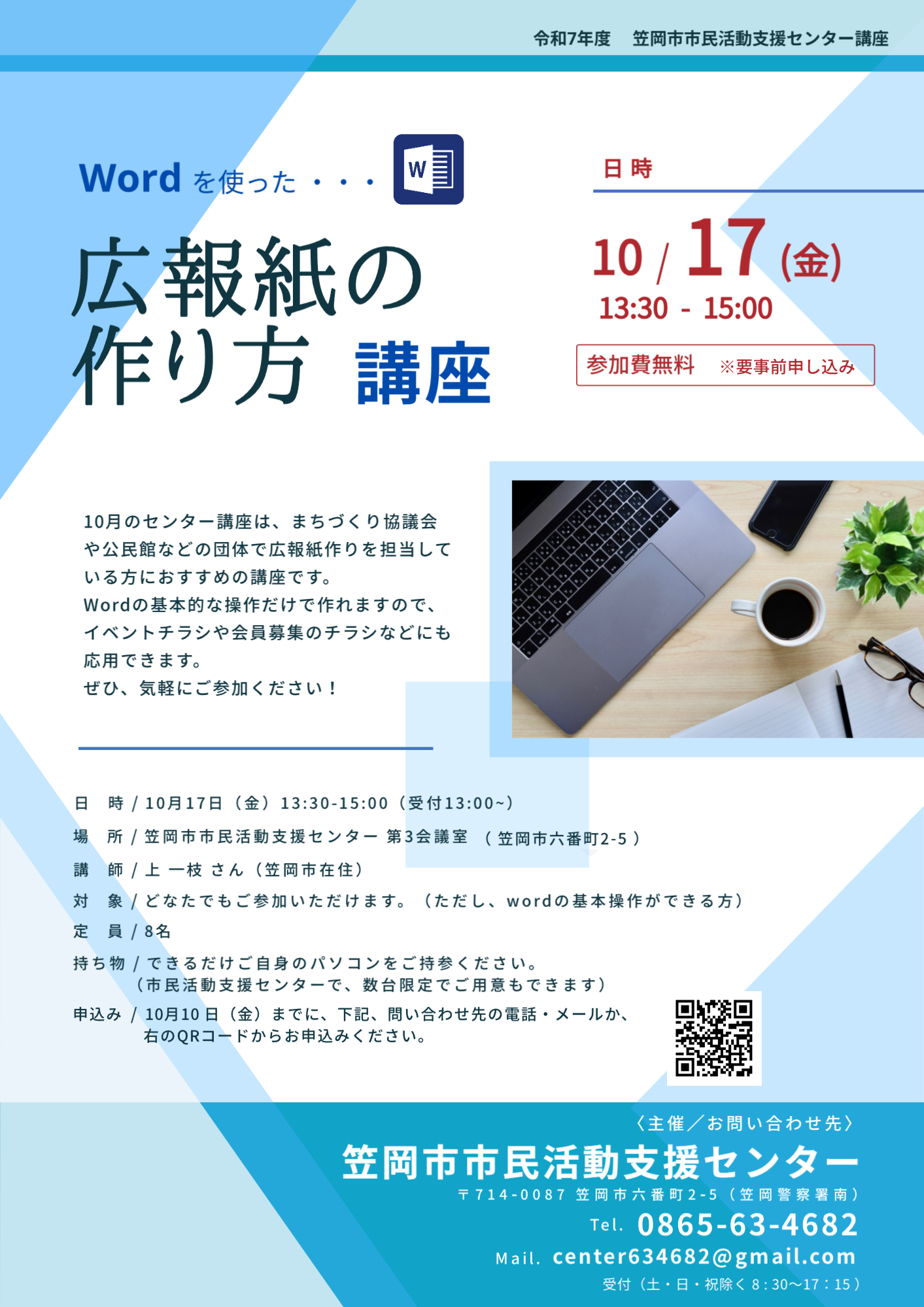 笠岡市市民活動支援センターでは、各種講座等を開催しております。