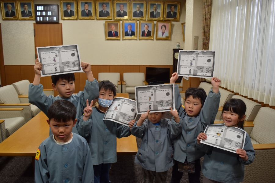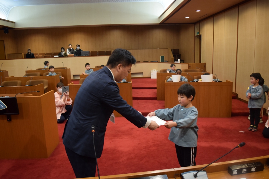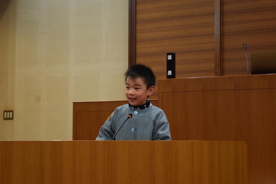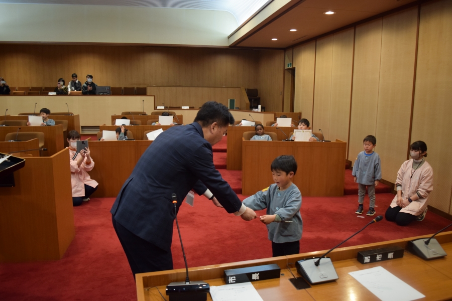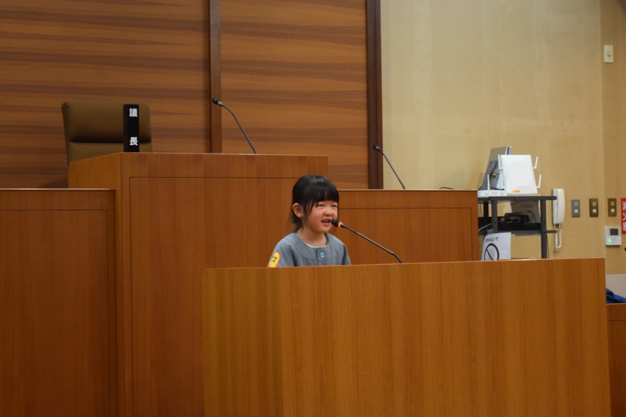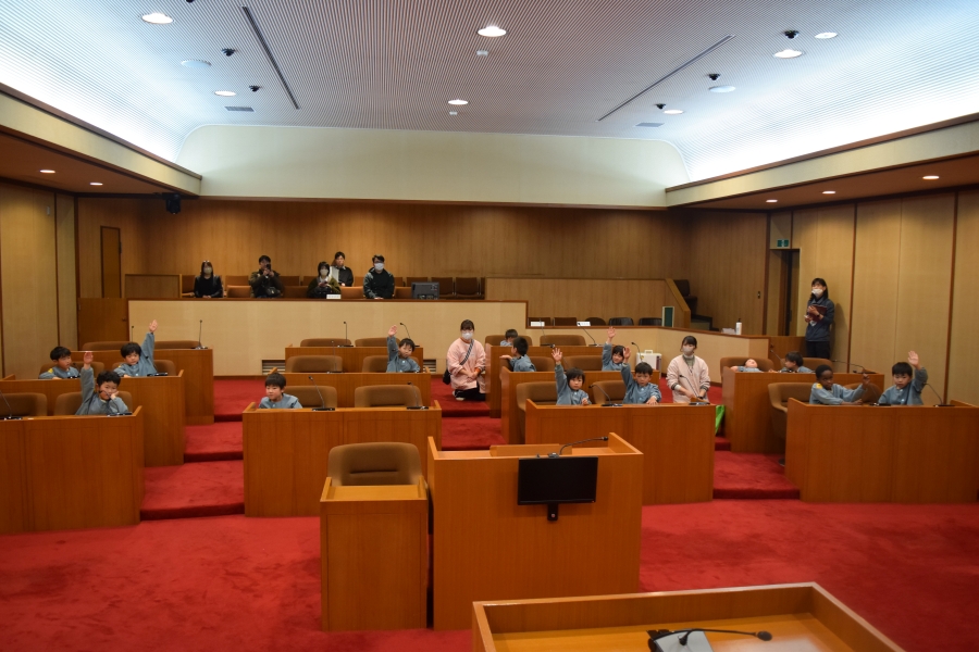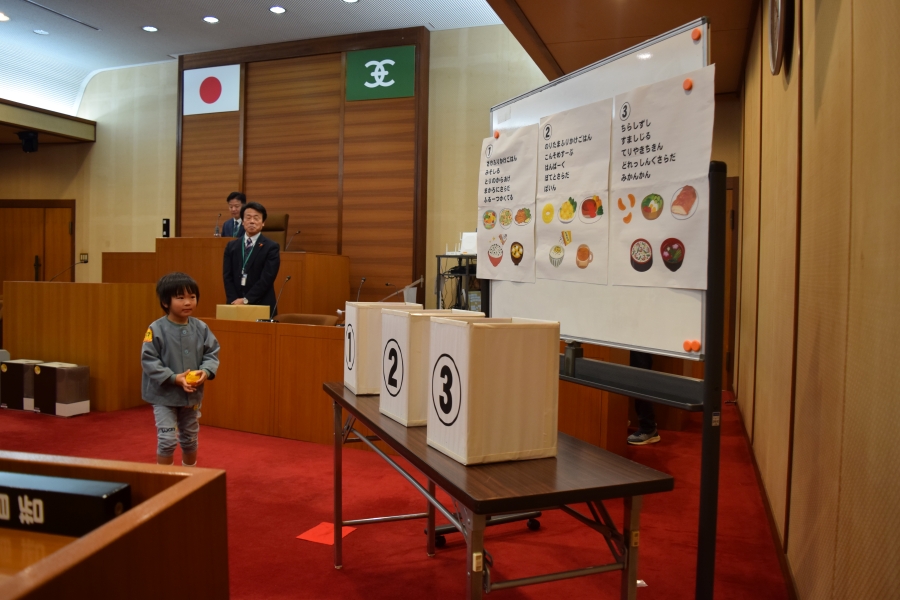 議場で行った「こども議会体験」では、園児が事前に考えた給食メニューの中から一番食べたい給食を、話し合いと多数決で決定しました。決定したメニューは3月の給食として実際に提供されます。